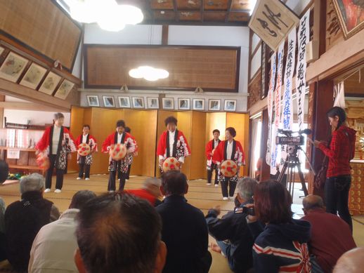 法要に続いて来賓紹介・挨拶が行われました。その次は、予定では住職講話だったのですが、変更されてアトラクションに。こういう急な予定変更も、この祭りのローカルさをよく表していて、個人的にはかえって好もしいというか。アトラクションは本堂向かって左の金屏風の前で行われるということで、来賓席が取り払われ、参加者は前に詰めることになりました。それによって、参加者は本堂中央で、ご本尊の前で真横を向いて踊りを見学するということに。こんなシチュエーションはなかなかありません。貴重な体験です。