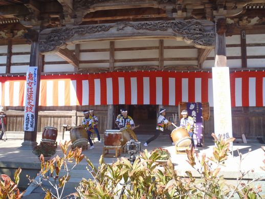 さて、この次はこの祭り最大の見所とも言える「鬼女紅葉太鼓」。しかし、まさかあの太鼓をこの本堂で演奏するのか?と不審に思っていたところ、やはり本堂前の屋外での演奏ということでした。皆さん続々と玄関から表へ出ます。それにしてもこの祭りの予想外の展開には、毎回毎回驚かされます。