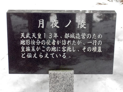 「月夜の陵」の標柱。山に続く小高い墳墓である。鬼無里に伝わる、天武天皇の鬼無里遷都伝説の跡の一つで、都から派遣され、当地で客死した皇族某の墳墓と伝えられる。また、内裏屋敷自体も遷都計画の際に定められた内裏の跡でもあるという。