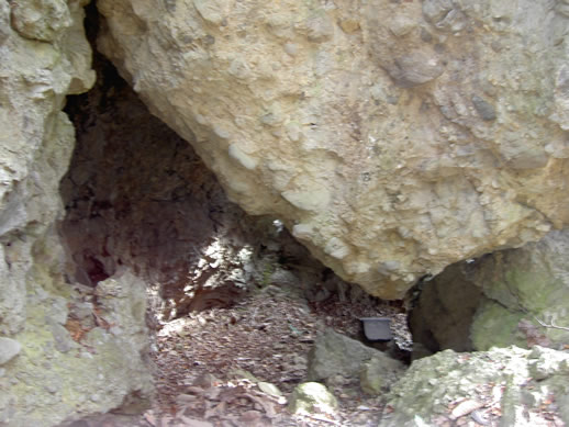 舞台岩より少し下、左手奥の小さな谷を渡った向こうにある「釜壇岩」(かまだんいわ)。紅葉達が食事などの煮炊きに使ったという、高さ・周囲とも二十メートル程の独立した巨岩。