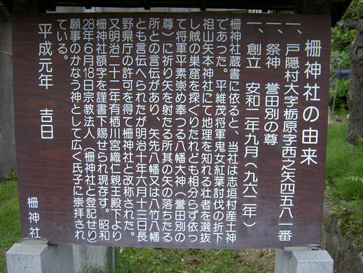 矢先八幡の案内板。かつては矢先八幡、または八竹八幡と呼ばれていたが、現在の名称は柵(しがらみ)神社である。