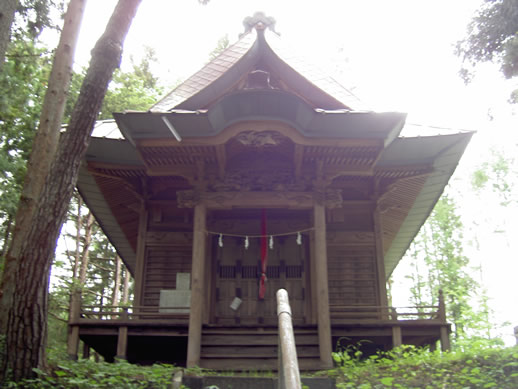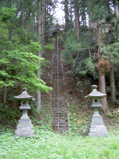 石段を登りきると社殿が見えてくる。社殿の周囲には矢竹が生えているが、これは維茂が放った矢が根付いたものだとか。しかも、維茂の放った矢は二本だったので、ここの矢竹は必ず二本双生するようになったという。