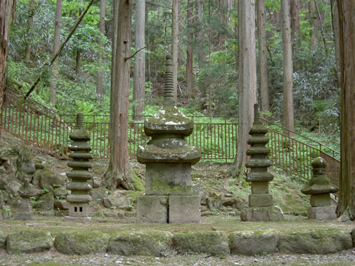 斜め後ろから見た多宝塔。石造多層塔(この写真では中央の細長い塔)も鎌倉時代のもので、大正時代に北向観音近くの山で水道工事の際、一八六基発見された石造塔群のうちの一基。当時学会を騒がせた大発見だったが、その後全て散逸してしまった。しかし地元の熱心の研究家が滋賀県の旧家に一基あるのを突き止め、昭和五十六年に当地へ戻されたという。各層の笠の反り、軒の厚み、相輪の形、一層から上層へ次第に減らした安定感など、鎌倉時代の特徴をよく備えた多層塔である。