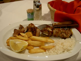 | ムサカ(右)とフタボディ・マリネ(左)。ムサカはなすとじゃがいも、ミートソース、パルメザンチーズを重ね焼きしたラザニアのようなようなもので、ギリシアを代表する料理。フタボディ・マリネはタコのマリネ。 | スブラキ。塩と胡椒で味付けした串焼きである。魚や肉などいろいろあるが、写真のものは確か豚だった。同じ皿に添え物が盛られている場合が多く、写真のものはフライドポテトとライスで、一般的である。今回の旅行で初めて米を食べた。 |