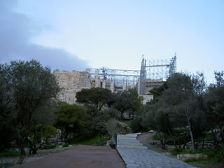 イロド・アティコス音楽堂ごしにパルテノン神殿を望む。イロド・アティコス音楽堂は161年、アッティカ(アテネとその南に続くアッティカ半島を含む地域の地方名)の大富豪イロド・アティコスの寄贈により建てられた。現在も野外劇場として使われている。![]() |