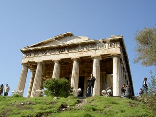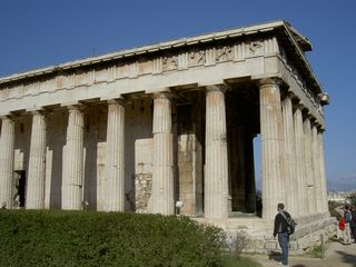 | ヘファイストス神殿のアップ。鍛冶の神ヘファイストスを祀っていた。また、かつてはアテネの英雄テセウス(ミノタウロス退治で有名)を祀っていたと思われていたため、今でもテセイオン、テッシオンの別名で呼ばれる。 | ||