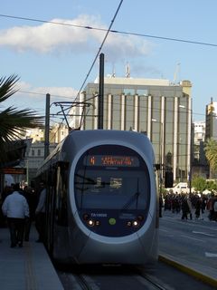 | シンタグマ広場と国会議事堂の間の通り(アマリアス大通り)に、トラムの始発駅がある。トラムはアテネオリンピックのための交通手段として2004年に開通したばかり。シンタグマと海岸部を結んでいる。 |