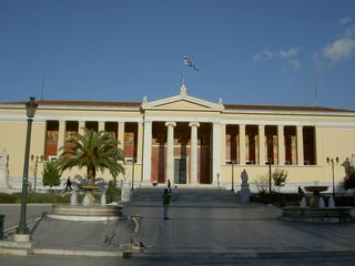 | 国立図書館。デンマークの建築家、ハンセン兄弟によって1902年に建てられた。モデルは古代アゴラのヘファイストス神殿。 | アテネ大学。同じくハンセン兄弟によって1864年に建てられた。モデルはアクロポリスのプロピュライア(前門)。 |