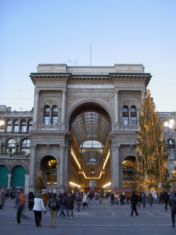 ヴィットーリオ=エマヌエーレ二世のガッレリア入口。イタリア統一(1861年)を記念して建てられたアーケードで、1877年の完成。ドゥオーモとスカラ座を結び、中にはブランド店やカフェなどオシャレな店が並ぶ。「世界一美しいアーケード」との呼び声もある。